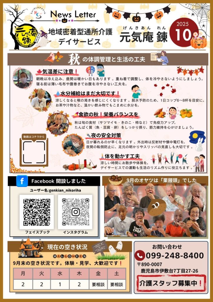 【元気庵】ニュースレター10月号 元気庵ニュースレター 2025.10.02 元気庵からの情報提供動画になります!秋は過ごしやすい季節にはなりますが、体調管理を欠かさず行うことでより楽しめる季節になります。今回は、秋の過ごし方や工夫を動画にしてみました!ぜひご覧ください!
