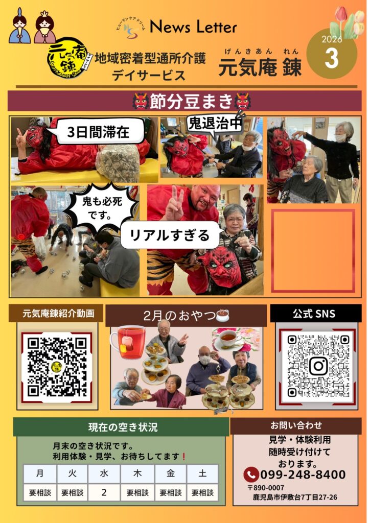 【元気庵】ニュースレター2026年3月号 元気庵ニュースレター 2026.02.28 今回は、毎年恒例の「節分豆まき」イベントの様子をお届けします。👹 鬼が3日間滞在!? 👹 鬼退治中の迫力シーン 👹 利用者様の笑顔あふれる瞬間写真だけでは伝わらない“リアルな楽しさ”をぜひ動画でご覧ください。元気庵鎌の雰囲気が伝わる内容となっています。