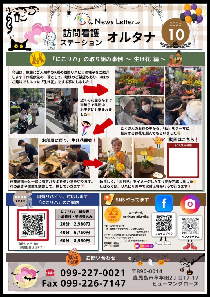 【訪問看護】ニュースレター10月号 訪問看護ニュースレター 2025.10.02 ニュースレター10月号は、にこりはの取り組みの特集動画を作成しました。今回の特集は、「生け花」編になります。どういうことをどこからやっているか詳細が気になる方はぜひご覧ください!